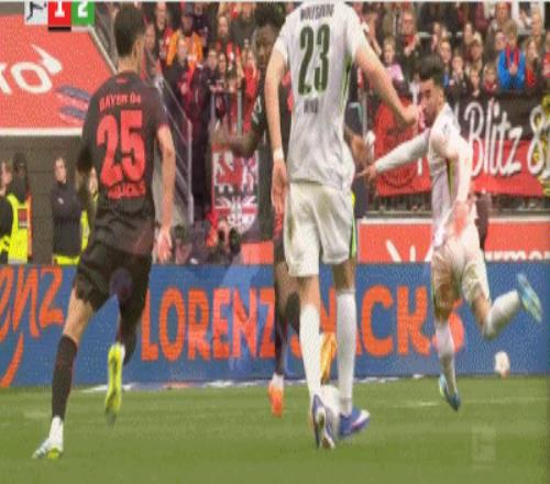 第73分鐘,易卜拉欣-馬扎推射得分,勒沃庫森5-3沃爾夫斯堡