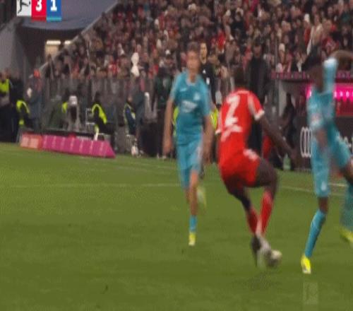 第6分鐘,普拉斯鏟倒阿方索-戴維斯,裁判出示黃牌