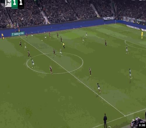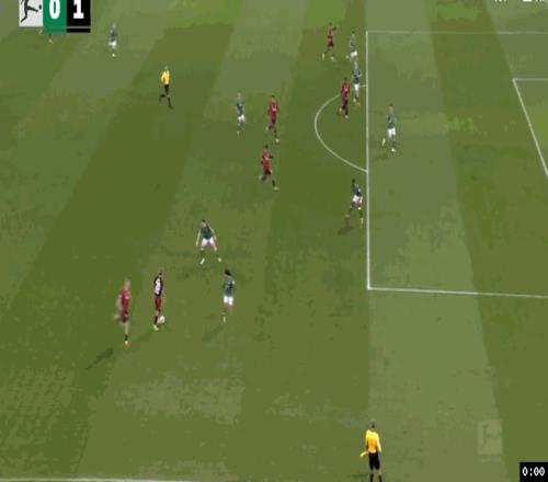開場(chǎng)僅1分鐘,法蘭克福后場(chǎng)左側(cè)大范圍轉(zhuǎn)移到前場(chǎng)右側(cè),日本球員堂安律插上將球卸下,堂安律帶球推進(jìn)到禁區(qū)前沿斜吊禁區(qū)左側(cè),布朗倒三角搶點(diǎn)頭球擺渡頂?shù)街新罚ɡ锬范鞫嘈〗麉^(qū)前沿?cái)D開防守球員搶點(diǎn)右腳外腳背凌空一撩,皮球直入球門左側(cè)死角,法蘭克福1:0取得夢(mèng)幻開局。第19分鐘,不萊梅后場(chǎng)斷球反擊,斯塔格送出精妙直塞,金馬高速插上禁區(qū)弧頂處拿球獲得半單刀良機(jī),只是他未能把握機(jī)會(huì),大力低射稍稍偏出門柱。