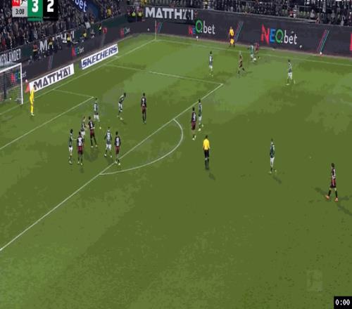 僅僅2分鐘后,不萊梅中后場(chǎng)左側(cè)斜長傳快速反擊,斯赫米德中路跟進(jìn)突入禁區(qū)獲得單刀機(jī)會(huì),稍微慢半拍的情況下,面對(duì)出擊的門將考阿,斯赫米德轉(zhuǎn)身往右邊做球,后排插上的米洛舍維奇迎球推射空門得手,不萊梅3:2反超了比分。從兩度領(lǐng)先到落后,法蘭克福沒有放棄,補(bǔ)時(shí)最后1分鐘,法蘭克福右路壓上,埃奇古亞卜強(qiáng)行突破下底,搶在皮球出底線之前將球兜回來,克瑙夫小禁區(qū)前沿?fù)岦c(diǎn)凌空推射,皮球直入球門右下死角,法蘭克福3:3壓哨絕平不萊梅。