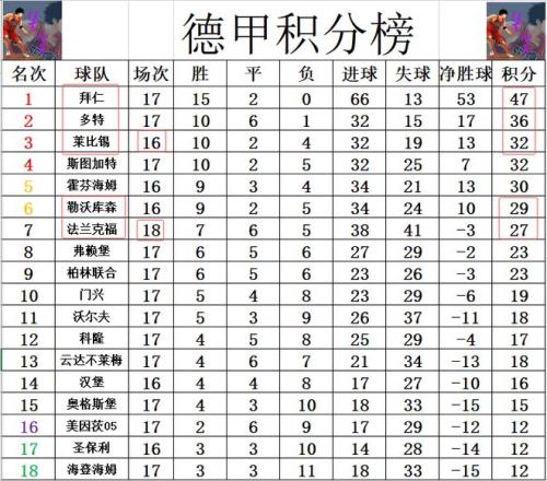積分榜方面,拜仁上半程以11分的巨大優(yōu)勢(shì)輕松拿到半程冠軍,本輪他們將在客場(chǎng)對(duì)陣下半程第一個(gè)對(duì)手萊比錫,本賽季首輪拜仁就是在主場(chǎng)6:0狂勝萊比錫開了個(gè)好頭,現(xiàn)在萊比錫和多特是潛在的稍微有些可能追趕拜仁的球隊(duì),因此本輪客場(chǎng)再戰(zhàn)萊比錫,將是拜仁下半程的關(guān)鍵一戰(zhàn)。法蘭克福今天本有機(jī)會(huì)追上勒沃庫森,只是兩度領(lǐng)先沒有把握機(jī)會(huì),最后絕平,差勒沃庫森2分還是排在第7。