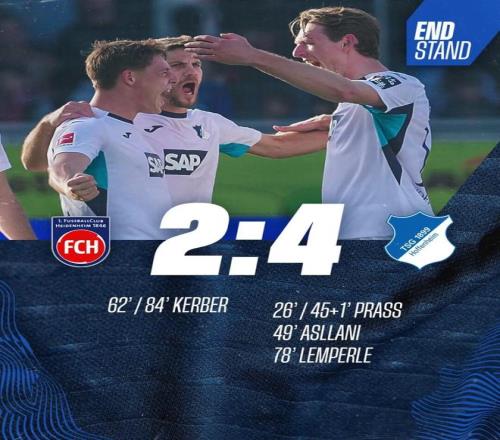 北京時間3月7日晚10點30分,“副班長”海登海姆主場挑戰聯賽第三霍芬海姆。上半場比賽,阿斯拉尼腳后跟妙傳,普拉斯跟進推射幫助霍芬海姆取得領先,隨后克拉馬里奇助攻普拉斯完成梅開二度。下半場比賽,阿斯拉尼補射建功,貝倫斯大力手拋球助攻克貝爾扳回一城,主隊球員康特進球被吹,杜爾長驅直入傳中,倫佩爾吃餅得手擴大比分,貝倫斯角球再度助攻克貝爾破門。最終,霍芬海姆4比2擊敗海登海姆,送對手12輪聯賽不勝。