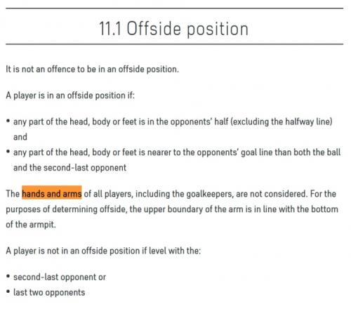 規則中寫道:“所有球員(包括守門員)的手和手臂均不計入越位判定。判斷越位時,手臂的上端以腋窩底部為準?!?/p>
