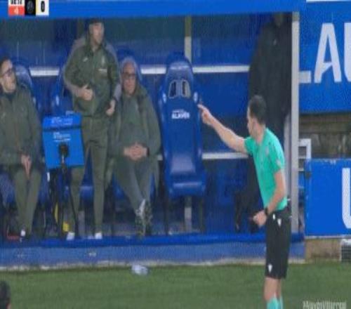 第90+5分鐘,不滿裁判吹罰,比利亞雷亞爾場下工作人員被罰下