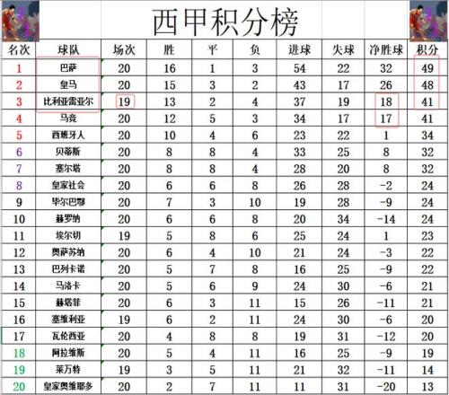 積分榜方面,巴薩11連勝被終止后,下半程剛開始,他們就被皇馬將分差縮小到了1分,兩隊(duì)的爭(zhēng)冠懸念還是很大。比利亞雷亞爾本輪輸球,無(wú)力再往前追皇馬,而且今天馬競(jìng)今天贏球后追了上來(lái),比利亞雷亞爾僅憑1個(gè)凈勝球守住第3。