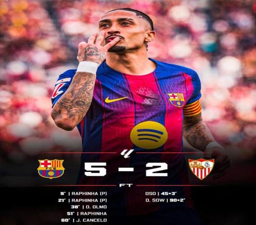 僅僅9分鐘之后,坎塞洛再次成為焦點(diǎn)。他從左路帶球長(zhǎng)驅(qū)直入,在禁區(qū)前連續(xù)變向晃開角度,隨后冷靜推射遠(yuǎn)角再下一城,巴薩將比分?jǐn)U大到5-1,比賽基本失去懸念。第92分鐘,塞維利亞的奧索左路送出精準(zhǔn)傳中,索烏搶點(diǎn)頭球破門,將比分改寫為2-5。最終巴薩5-2完成了一場(chǎng)徹底的復(fù)仇,同時(shí)也喜提球隊(duì)西甲4連勝,在爭(zhēng)冠最關(guān)鍵階段,他們依舊領(lǐng)先皇馬4分,壓力再次扔回給了銀河戰(zhàn)艦。