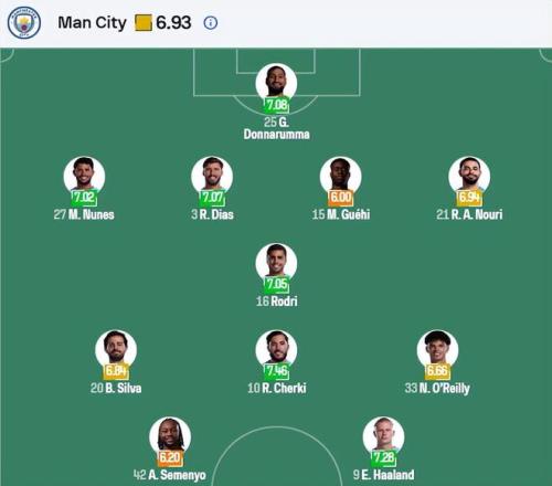 曼城(4-2-3-1):多納魯馬;努內斯、魯本·迪亞斯、格伊、艾特-努里;羅德里、奧賴利;塞梅尼奧、伯納多·席爾瓦、謝爾基;哈蘭德。格瓦迪奧爾、劉易斯傷缺,薩維尼奧出戰難講。