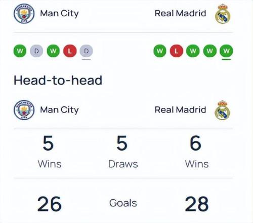 曼城近5場比賽2勝1平2負,狀態起伏不定。上周末英超客場1-1戰平西漢姆聯,連續兩輪戰平后與榜首阿森納的差距被拉開至9分。皇馬近5場比賽4勝1負,狀態明顯回升。上周末西甲主場4-1大勝埃爾切,目前聯賽中落后巴薩4分排名第2位。