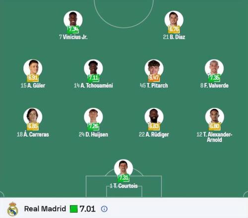 皇馬(4-3-3):庫爾圖瓦;阿諾德、赫伊森、呂迪格、弗蘭·加西亞;巴爾韋德、瓊阿梅尼、卡馬文加;布拉欣·迪亞斯、居萊爾、維尼修斯。米利唐、塞瓦略斯、羅德里戈、門迪、阿森西奧多名球員因傷缺陣。