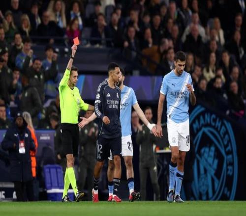 帶著首回合0-3的巨坑回到主場,曼城本來就壓力山大。結果比賽才踢了20分鐘,B席在禁區內一肘擋出了維尼修斯的必進球。VAR明察秋毫,法國名哨蒂爾潘沒有絲毫手軟,直接掏出紅牌將他罰下。這可是31歲的B席職業生涯第一次染紅!