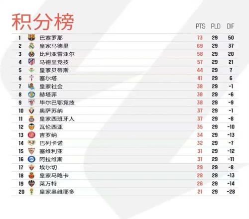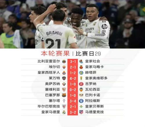 北京時間3月23日凌晨,西甲第29輪10場結束全部較量。本輪焦點對話自然是“馬德里德比”,皇家馬德里最終3比2力克馬德里競技報第一回合一箭之仇,繼續排名第二的同時,與馬競的分差也來到了11分;巴塞羅那憑借阿勞霍的進球,1球小勝巴列卡諾繼續領跑西甲;比利亞雷亞爾3比1擊敗皇家社會,實現了對馬競的反超;而皇家貝蒂斯本輪1比2負于畢爾巴鄂競技,已經落后歐冠區達13分,機會愈發渺茫。