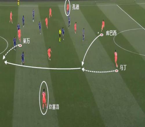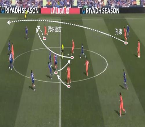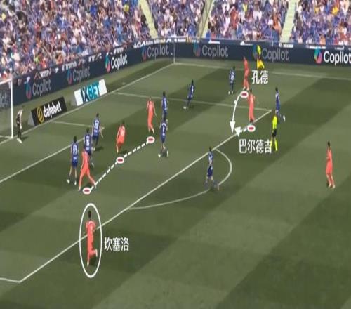 這一次的進攻很典型,巴薩一側邊鋒內收時,邊后衛就要跟邊鋒一樣拉開寬度。孔德的特點,是更合適邊鋒拿球后,他無球套上外線接應,所以他相對靠后一點,但不等于說孔德不參與進攻。