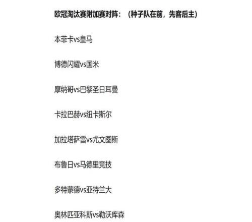 接下來的,淘汰賽附加賽比賽,時間為2月17日、18日,以及2月24日和2月25日。剛好是中國的農歷春節期間,球迷可以在假期時間里享受歐冠比賽了。