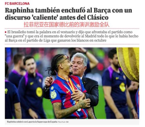 西超杯的半決賽、決賽,巴薩分別5-0橫掃畢爾巴鄂競技、3-2戰勝皇馬,拉菲尼亞均是梅開二度,2場4球,狀態極佳。除了進球、助攻、壓迫、防守之外,拉菲尼亞還是巴薩的戰魂。《世界體育報》就透露拉菲的激情演講: