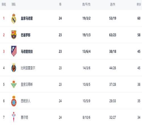 在積分榜上,皇馬以60分登上榜首位置。而巴薩則掉到了第2的位置。巴薩總積分是58分,比皇馬少了2分。不過,巴薩少踢1輪。如果接下來巴薩能夠擊敗赫羅納,那么還是能夠重登榜首。馬競只拿到45分,排名第3。第4的是比利亞雷亞爾,也是45分。皇家貝蒂斯以38分排名第5。西班牙人以35分排名第6。