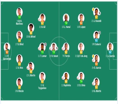 巴薩首發:13-霍安·加西亞、5-庫巴西、18-赫拉德·馬丁(63’3-巴爾德)、23-孔德、24-埃里克·加西亞(73’4-阿勞霍)、16-費爾明、21-德容、20-奧爾莫(83’22-貝爾納爾)、7-費蘭(73’9-萊萬)、10-亞馬爾、11-拉菲尼亞(63’19-巴德吉)。