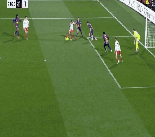 第58分鐘,亞馬爾將球傳到后點,拉菲尼亞的射門打在林孔的頭上出了底線。