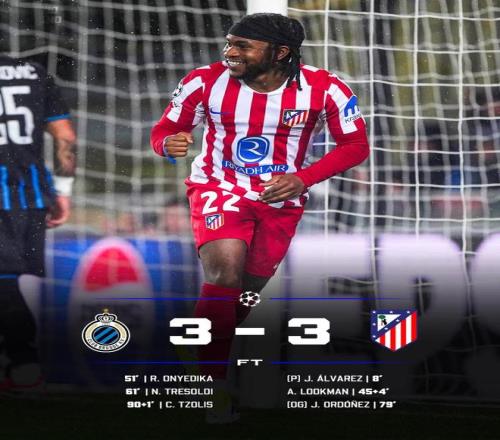 馬德里競技客場挑戰布魯日,原本一度手握兩球優勢,卻在第89分鐘遭絕平,西蒙尼無奈只能接受3-3平局收場。