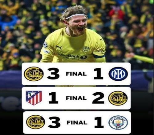 這是挪威俱樂部在歐冠歷史第2次擊敗意甲球隊,上一次還要追溯到1996年羅森博格擊敗AC米蘭。憑借這場勝利,博德閃耀解鎖了一項極為了不起的成就,成為歐冠歷史上第4支達成三連勝的非五大聯(lián)賽球隊。此前做到這一點的三支球隊,帕納辛納科斯、本菲卡、圣彼得堡澤尼特,無一不是各自時代的梟雄。更恐怖的是,閃耀哥的三連勝含金量極高:客場2-1勝馬競、主場3-1勝曼城、主場3-1勝國米,刀下不斬無名之輩。