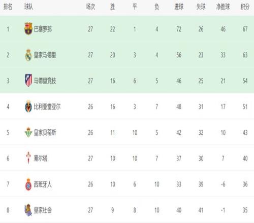 在積分榜上,巴薩排名榜首。巴薩戰績是22勝1平4負,拿到67分。而只拿到63分的皇馬排名第2,落后巴薩4分。馬競贏球之后,總積分達到54分,排名第3,與身前的兩支球隊差距依然很大。比利亞雷亞爾以51分排名第4。第5的是皇家貝蒂斯,拿到了43分。