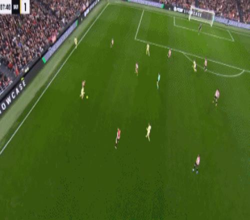 易邊再戰(zhàn)兩隊依然是對攻之勢,開場2分鐘,巴薩左路推進,拉什福德禁區(qū)前沿大力兜射,門將西蒙奮力將球撲出。第52分鐘,畢爾巴鄂競技左路快攻也制造機會,納瓦羅禁區(qū)前沿擺脫防守送出精妙直塞,桑切特反越位成功突入禁區(qū)接球獲得半單刀機會,只是他往前調(diào)整轉(zhuǎn)身掃射沒打上力量,門將加西亞穩(wěn)穩(wěn)將球撲住。第67分鐘,巴薩左路反擊,佩德里45度角處拿球內(nèi)切擺脫防守后精妙斜塞右側(cè),畢爾巴鄂競技后防漏人,無人防守的亞馬爾禁區(qū)內(nèi)從容接球,橫切調(diào)整2步后左腳大力兜射,皮球擊中遠端門柱內(nèi)側(cè)彈入網(wǎng)窩,巴薩1:0打破僵局。之后畢爾巴鄂競技雖然攻勢不弱,但他們就是無力把握機會,最終巴薩客場1:0險勝。