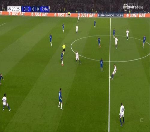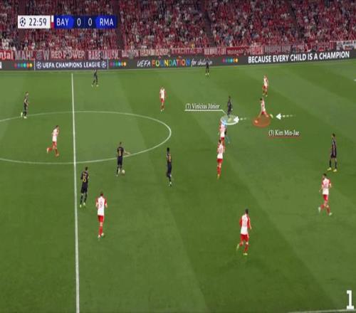 當維尼修斯能與隊友配合并前插身后時,他在肋部區域就能構成威脅,就像下圖中他在2021-22賽季四分之一決賽對陣切爾西時助攻本澤馬那樣。