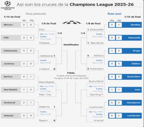 上半?yún)^(qū):加拉塔薩雷與利物浦的勝者,將迎戰(zhàn)巴黎圣日耳曼和切爾西的勝者;皇家馬德里若能淘汰曼城,將在八強遭遇拜仁與亞特蘭大的勝者。