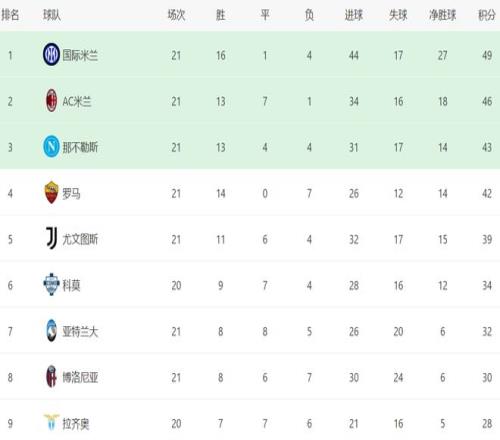 在積分榜上,國際米蘭依然高居榜首,總積分是49分。而AC米蘭贏球之后,總積分達到46分,排名第2,只比國際米蘭少3分。衛(wèi)冕冠軍那不勒斯43分排名第3,依然有沖擊冠軍的希望。羅馬3連勝之后,殺入了歐冠區(qū),總積分42分排名第4。尤文圖斯則掉到了第5名的位置,總積分是39分。科莫少賽一場,總積分是34分,排名第6。亞特蘭大32分排名第7。博洛尼亞30分排名第8。拉齊奧只拿到28分,排名第9。