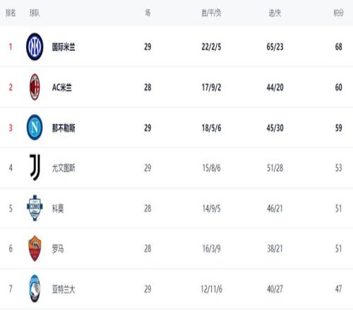 在積分榜上,國際米蘭依然占據榜首位置,戰績是22勝2平5負,拿到68分。而AC米蘭以60分排名第2,足足落后8分。不過,AC米蘭少踢1場,如果接下來的比賽能夠獲勝,就能夠把劣勢縮小到5分。那不勒斯贏球之后,以59分排名第3。那不勒斯落后國際米蘭9分,爭冠希望不大。尤文圖斯總積分達到53分,升到了第4名。科莫51分掉到第5名。羅馬也是51分,排名第6。