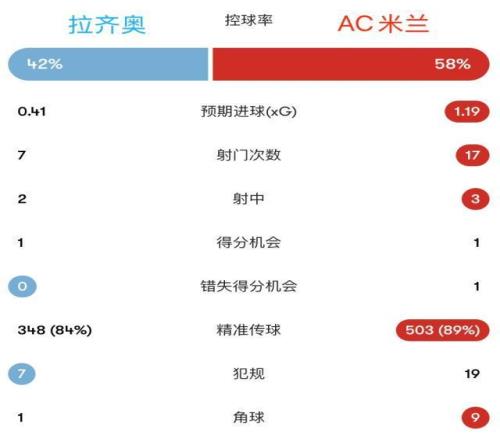 拉齊奧全場7次射門,預(yù)期進(jìn)球數(shù)為0.41,只有2次射正,而米蘭17次射門,預(yù)期進(jìn)球數(shù)為1.19。