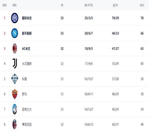 在積分榜上,國際米蘭以78分高居榜首,戰績是25勝3平5負。那不勒斯輸球之后,依然是66分,被國際米蘭甩開12分。冠軍歸屬基本失去了懸念。AC米蘭以63分排名第3。第4的是尤文圖斯,拿到60分。科莫58分,排名第5。羅馬戰平亞特蘭大之后,也是58分,排名第6,與歐冠區有2分的差距。亞特蘭大54分,排名第7。