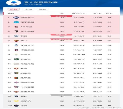 在最新積分榜中,國米33輪積78分,領先第二名的那不勒斯12分。若下輪國米打平,且那不勒斯輸球,則國米奪冠;若,國米下輪贏球,那不勒斯不能取分,則國米同樣奪冠。此外,根據意甲規(guī)則,若賽季結束時積分相同,則需要進行附加賽。