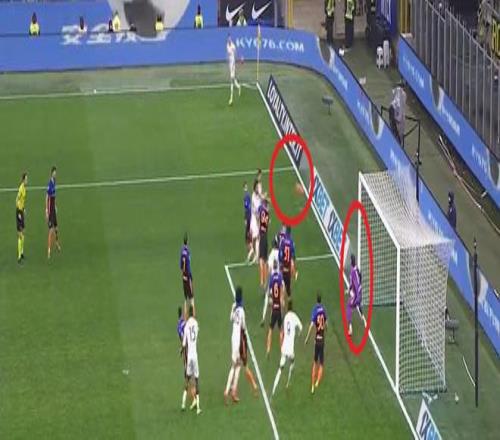 有人會說,這種角球攻門距離如此之近,一般來說門將是極難給出有效反應的。沒錯,但話是這么說,并不等于角球只要形成攻門,門將就只能繳槍投降。索默在丟球當中有沒有給出反應?有!但他在做出有效動作的時候,雙手拍到球的時候,球已經完整越過門線了。
