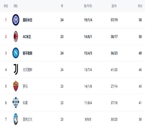在積分榜上,國際米蘭一枝獨秀,19勝1平4負的成績非常亮眼,拿到58分高居榜首。而AC米蘭只拿到50分。雖然AC米蘭少賽一場,但與國際米蘭這么大的差距想要追上去難度極高。那不勒斯只拿到49分,排名第3,爭冠希望極其渺茫。尤文圖斯戰(zhàn)平后,總積分達到46分,排名第4。羅馬以43分排名第5。科莫則以41分排名第6。亞特蘭大只拿到36分,排名第7。而錯失勝利的拉齊奧只拿到33分,排名第8。