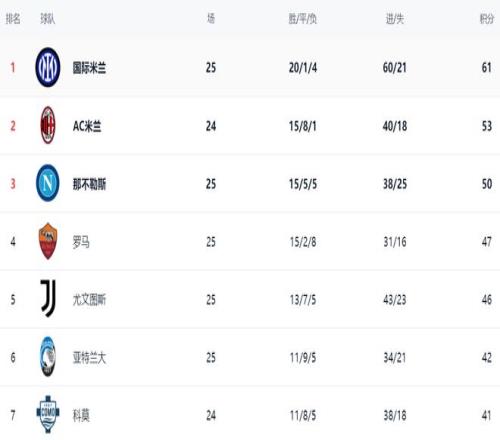 在積分榜上,國際米蘭高居榜首,拿到61分,距離冠軍越來越近。AC米蘭53分排名第2,足足落后8分。不過,AC米蘭少踢1輪。那不勒斯戰平之后,總積分是50分,排名第3。而羅馬則超越了尤文圖斯,升到了第4名。羅馬總積分是47分,尤文圖斯則拿到46分。亞特蘭大42分排第6。第7的是科莫,拿到41分。