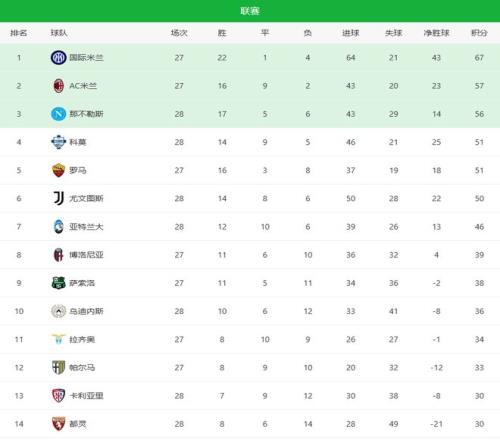 目前,國際米蘭依舊牢牢占據榜首位置,以67分遙遙領先。排名第二的是AC米蘭,他們目前拿到57分,落后國米10分。衛冕冠軍那不勒斯則以56分排在第三。