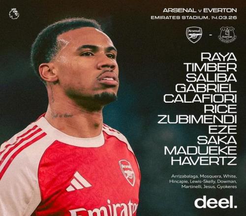 阿森納首發:1-戴維-拉亞、12-廷貝爾、2-薩利巴、6-加布里埃爾、33-卡拉菲奧里、41-賴斯、36-蘇比門迪、10-埃澤、7-薩卡、20-馬杜埃凱、29-哈弗茨