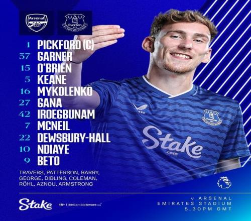埃弗頓首發:1-皮克福德、37-詹姆斯-加納、15-杰克-奧布賴恩、5-邁克爾-基恩、16-米科連科、27-伊德里薩-蓋伊、42-伊羅格布南、7-麥克尼爾、22-迪尤斯伯里-霍爾、10-恩迪亞耶、9-貝托