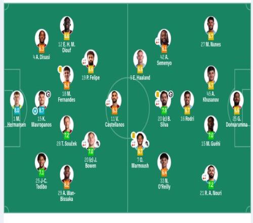 曼城替補(bǔ):1-特拉福德、3-魯本·迪亞斯、6-阿克、8-科瓦契奇、14-尼科·岡薩雷斯