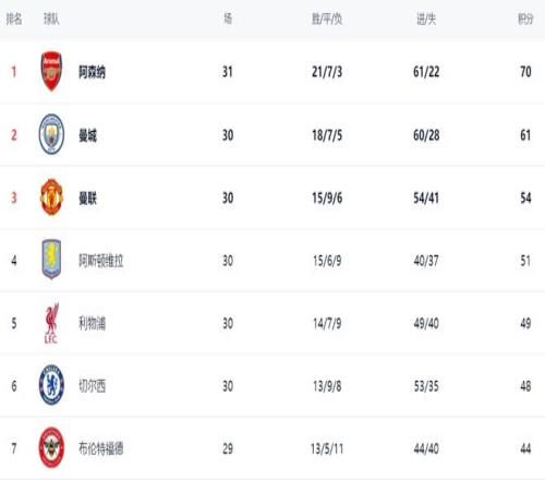 在積分榜上,阿森納獨(dú)領(lǐng)風(fēng)騷,以70分排名榜首。曼城頻頻掉鏈子,與阿森納的差距越來越大,落后了9分,排名第2,爭(zhēng)冠基本無望了。曼聯(lián)贏球之后,總積分達(dá)到54分,鞏固了第3的位置。阿斯頓維拉51分,排名第4。這輪利物浦只拿到1分,總積分達(dá)到49分,排名第5,無緣殺入前4。切爾西48分,掉到第6名了。