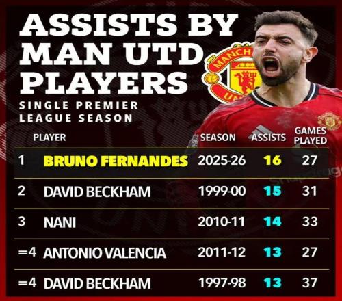 更值得一提的是,憑借助攻梅開(kāi)二度,他也超越了曼聯(lián)隊(duì)內(nèi)由小貝保持長(zhǎng)達(dá)26年的英超15次助攻紀(jì)錄。在1999/2000賽季中,小貝貢獻(xiàn)了15次英超助攻,而現(xiàn)在B費(fèi)的助攻次數(shù)達(dá)到16次。