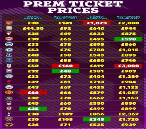 影響球票價格變化因素很多,包括俱樂部地理位置、上賽季成績、歷史地位、對手強弱等。平均收入最高的倫敦票價普遍較高,其他地區票價較低。但曼徹斯特和利物浦因俱樂部歷史成績更好,票價更貴。傳統豪門近年票價上漲,球票供不應求是主因。俱樂部當前成績也會導致球票上漲,上賽季和本賽季阿斯頓維拉、紐卡斯爾聯均因進入歐戰,票價對應提高了3%至5%。因對手不同票價也有差別,以阿森納主場上層中心區零售票價為例,處于68-168歐元(570-1400元)之間。較低價適用于對弱旅,較高價適用于對爭冠對手曼城或德比死敵熱刺。