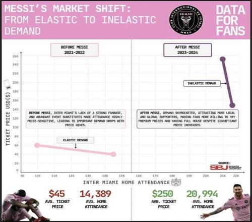 北美足球聯賽的動態定價,最經典的是2023年7月梅西加盟邁阿密國際的首秀。這場對陣墨西哥藍十字的中北美聯賽杯比賽,因為梅西的出現,賽前最低票價從29美元(約合210元人民幣)飆升到325美元(2340元),激增11.2倍!之后為平息球迷對票價火箭式上升的不滿,邁阿密國際主場對奧蘭多城的最低票價回落到105美元(710元),但比賽開始前又漲到160美元(1150元),不過,比賽因雷暴天氣被推遲1.5小時,最低票價又降到73美元(520元)。