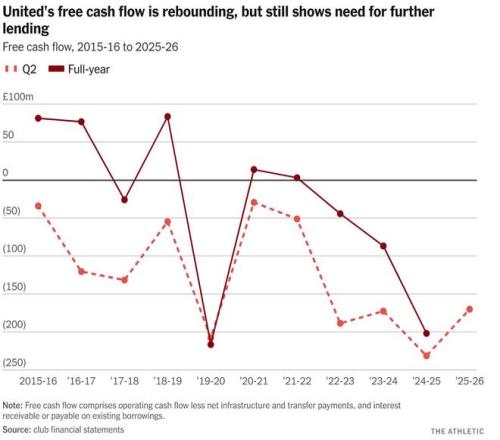 首先,拉特克利夫注入了2.385億英鎊,這筆錢,除了卡靈頓訓練基地的工程之外,幾乎都花在了轉會費和運營成本上。此后,曼聯借貸愈發頻繁。再加上其他方面的削減,使得在不到兩年的時間里,轉會總支出超過5億英鎊。曼聯從未瀕臨破產,但一個有趣的假設是,如果沒有人出現并注入拉特克利夫投入的那些資金,會發生什么。