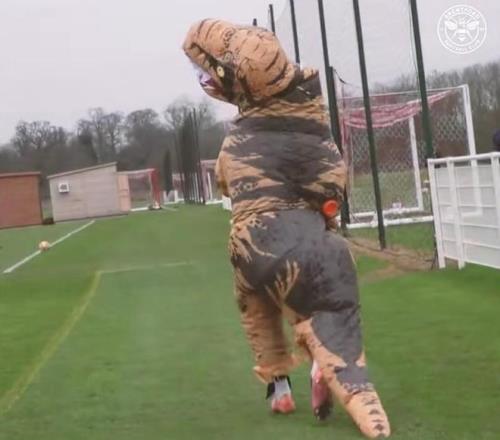 顯然是在我的單身派對上,朋友們讓我打扮成空乘人員的樣子去美國。另外,我在布倫福德膝蓋受傷復(fù)出后,第一次訓(xùn)練時,我打扮成了恐龍的樣子。?