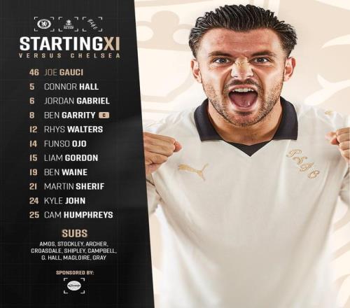 切爾西首發:1-羅伯特-桑切斯、27-古斯托、29-韋斯利-福法納、4-阿達拉比奧尤、21-哈托、45-拉維亞、17-安德雷-桑托斯、41-埃斯特旺、10-帕爾默、7-佩德羅-內托、20-若昂-佩德羅