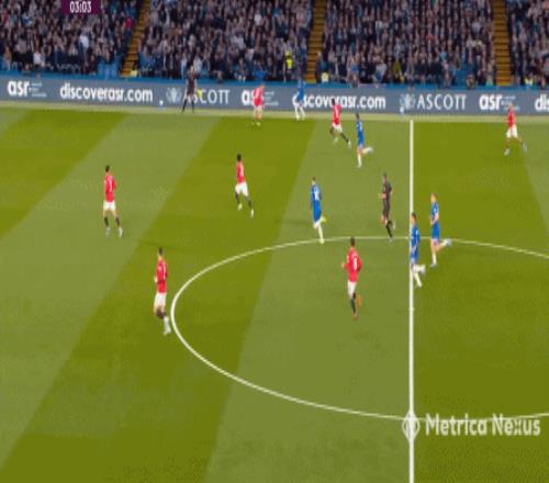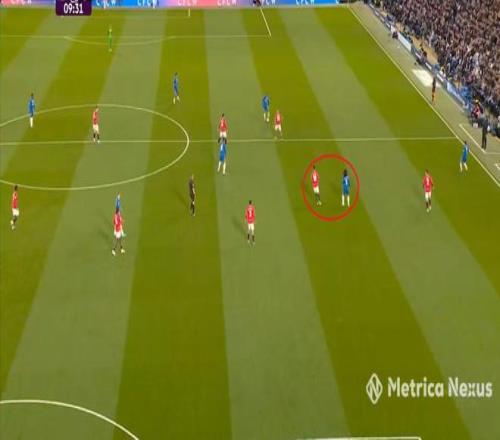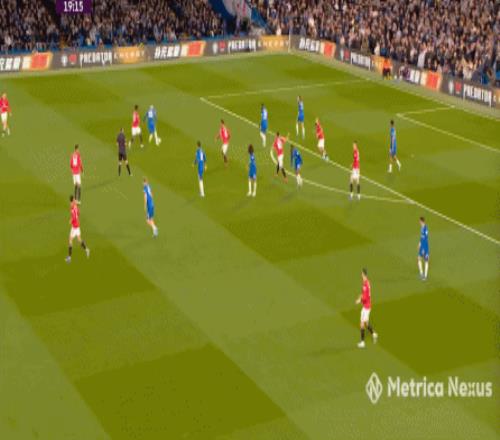 回到帕爾默沖擊的這次鏡頭,從高空視角能看到,切爾西之所以用同樣的三中場就打穿了曼聯,恩佐之所以能輕松轉身、出球,很大程度上是和布魯諾未能成功卡線: