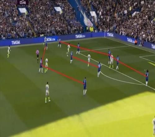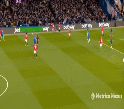 不算人盯人,但在切爾西將陣型鋪開之后,帕爾默確實會因為逆足的打法而偏向右半扇,這里就會出現對位的情況,所以在無球的時候,你可以看到梅努對帕爾默的移動確實有敏感度: