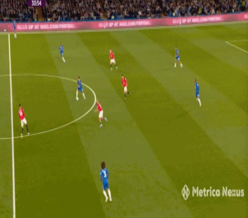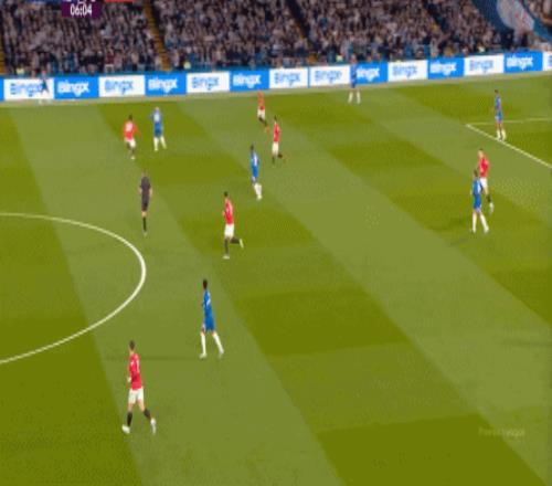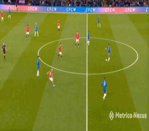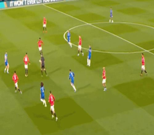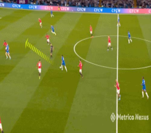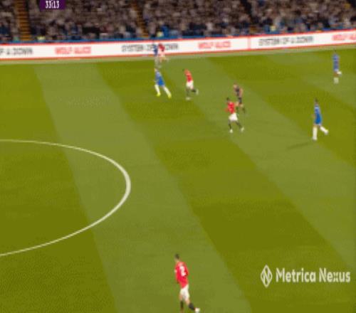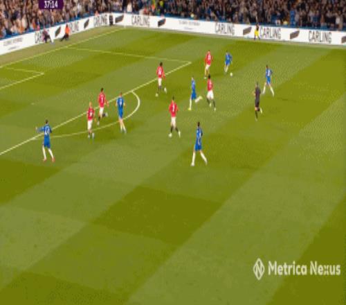 那么到了這場比賽,當切爾西在中場有些優勢,不用四中場的配置也能打穿曼聯的時候,帕爾默就要進行更多的沖擊,而不是接應,就像第9分鐘這次進攻: