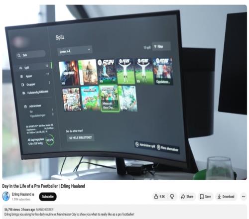 在VLOG中,哈蘭德玩游戲FC26(改名前為FIFA),并在游戲中操縱曼城,哈蘭德用“自己”打入兩球,并和游戲里一樣展示了自己兩個標志性慶祝動作。